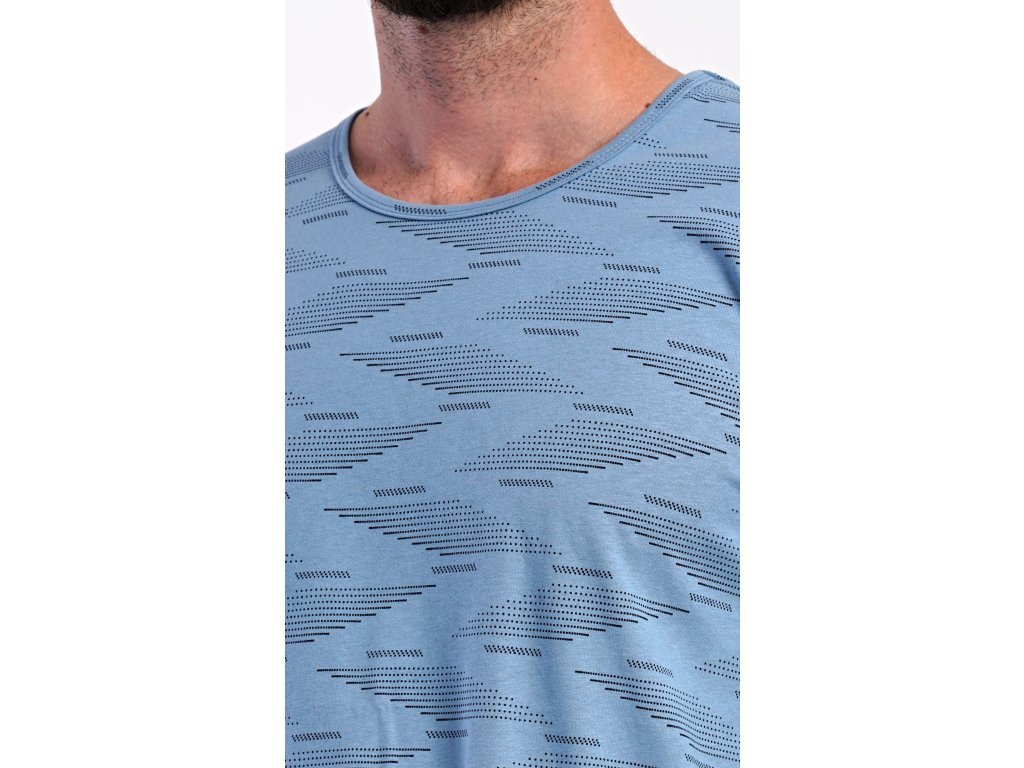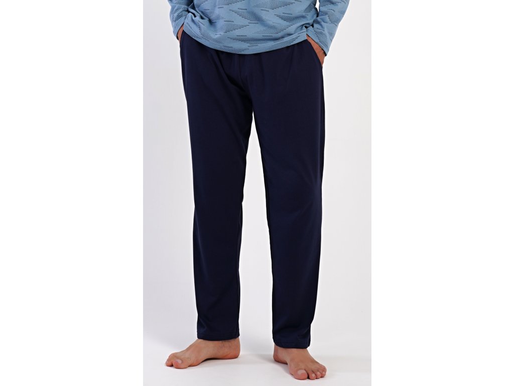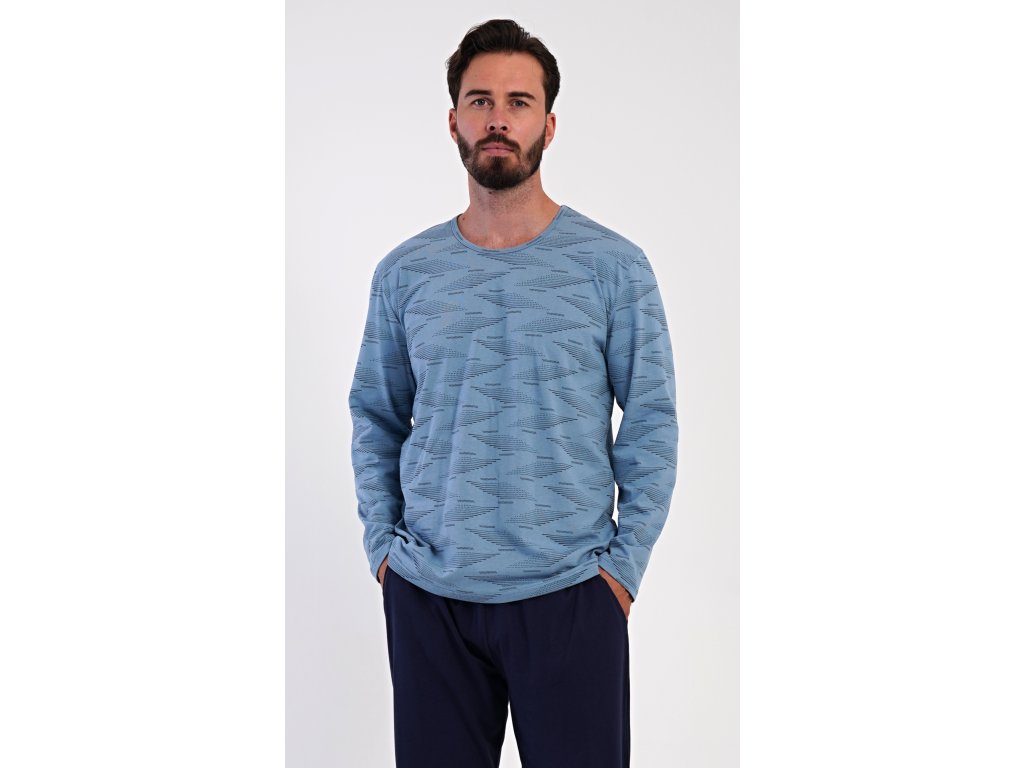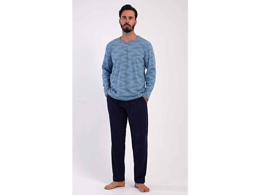 Pánské dlouhé bavlněné pyžamo Arnošt. Pánské pyžamo se skládá z trika s dlouhým rukávem a dlouhých kalhot. Triko s kulatým výstřihem je potištěno geometrickým vzorem. Jednobarevné kalhoty mají v pase gumu, šňůrku na stažení a praktické kapsy. Použitý materiál s obsahem bavlny 100% je poddajný a příjemný na dotek.