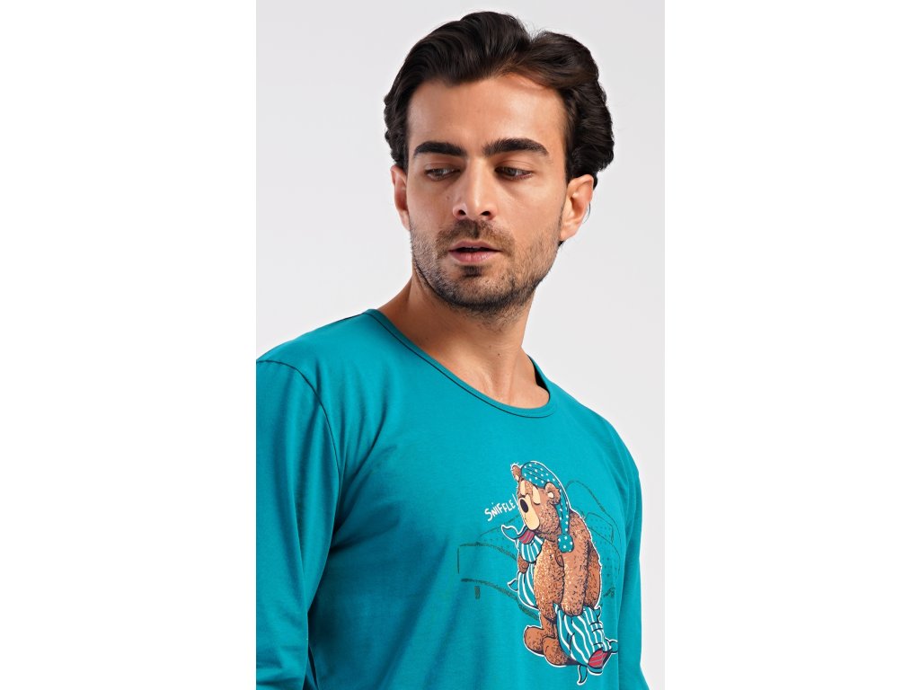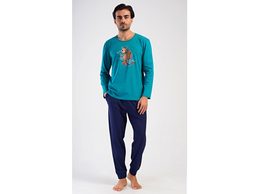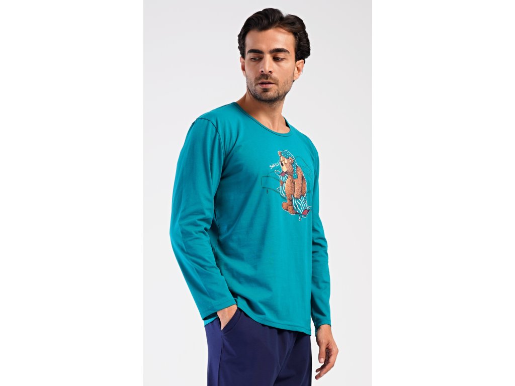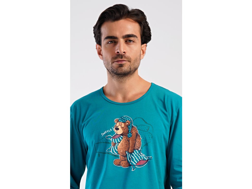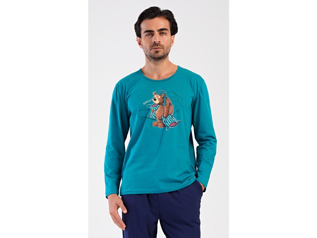Pánské dlouhé bavlněné pyžamo Méďa Ospalec. Pánské pyžamo se skládá z trika s dlouhým rukávem a dlouhých kalhot, které jsou zakončeny lemy. Triko s kulatým výstřihem zdobí na hrudi obrázek ospalého medvěda. Jednobarevné kalhoty mají v pase gumu, šňůrku na stažení a praktické kapsy. Použitý materiál s obsahem bavlny 100% je poddajný a příjemný na dotek.