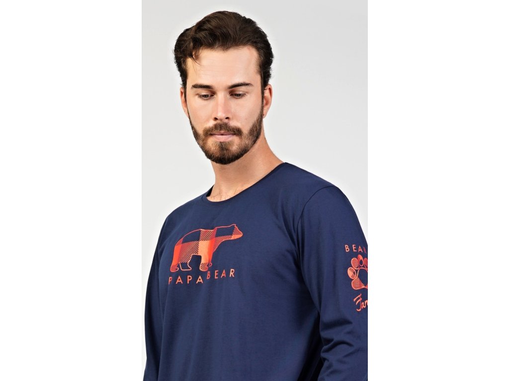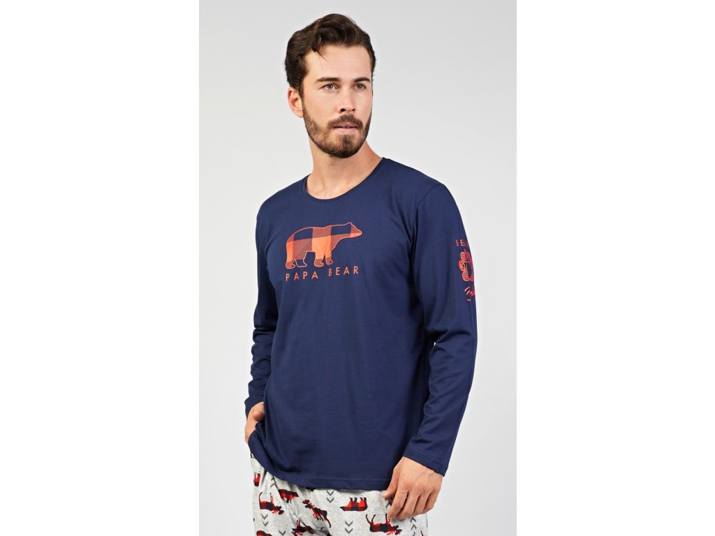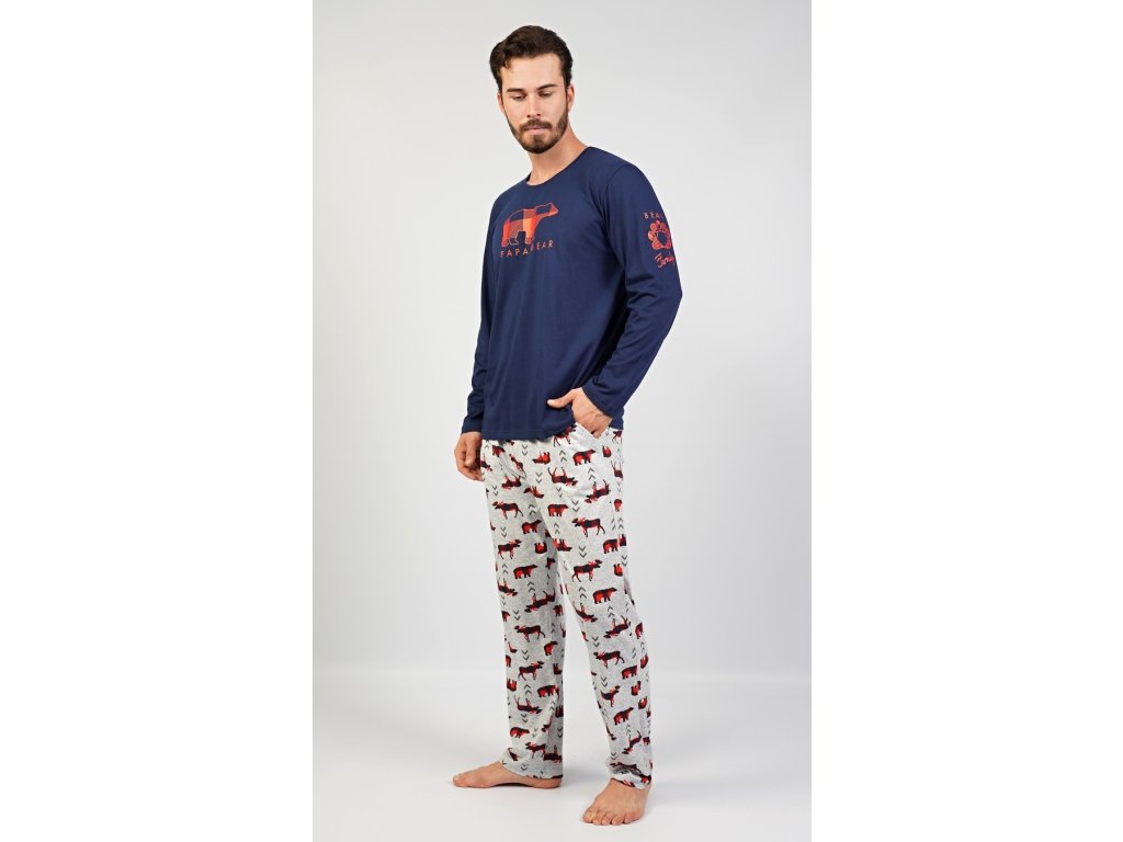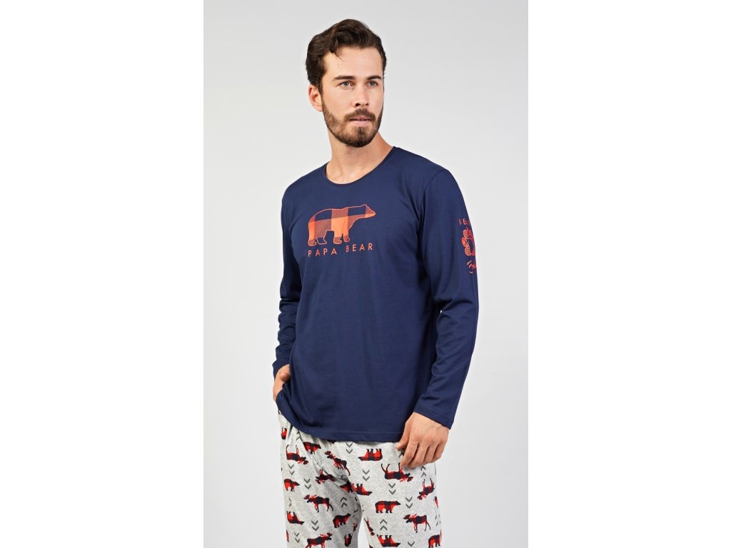 Pánské pyžamo dlouhé Papa bear. Pánské pyžamo se skládá z trika s dlouhým rukávem a dlouhých kalhot. Triko je jednobarevné s konturou medvěda a nápisem Papa bear. Kalhoty jsou světle šedé s celopotiskem medvědů a sobů. Kalhoty jsou do gumy a na stažení šňůrkou v pase. Oceníte i praktické kapsy. Použitý materiál je poddajný a příjemný na dotek.