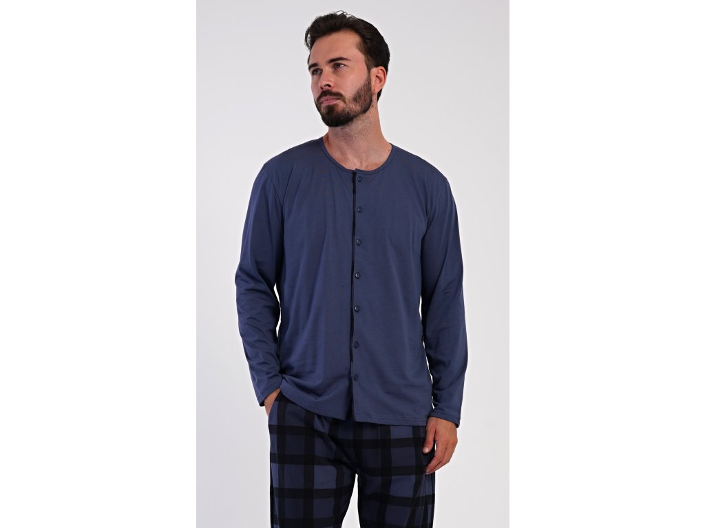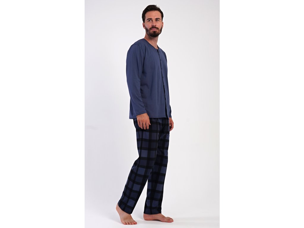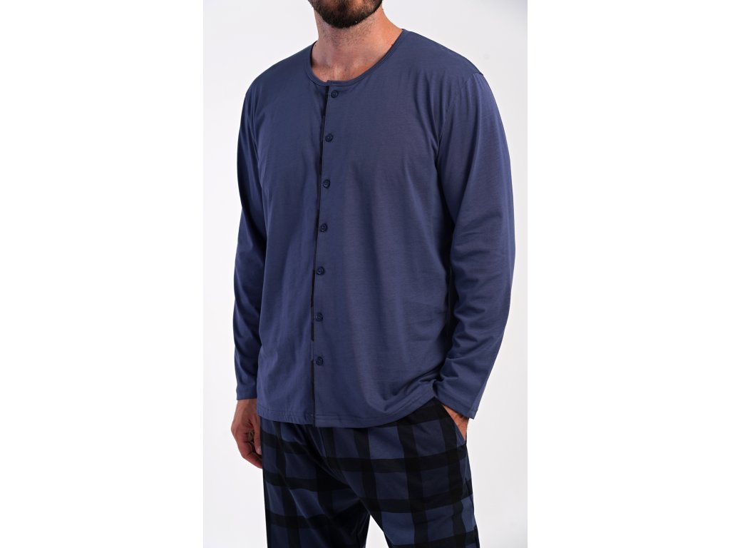 Pánské dlouhé bavlněné pyžamo Rudolf. Pánské pyžamo se skládá z trika s dlouhým rukávem a dlouhých kalhot. Triko s kulatým výstřihem má zapínání na knoflíky. Kárované kalhoty mají v pase gumu, šňůrku na stažení a praktické kapsy. Použitý materiál s obsahem bavlny 100% je poddajný a příjemný na dotek.