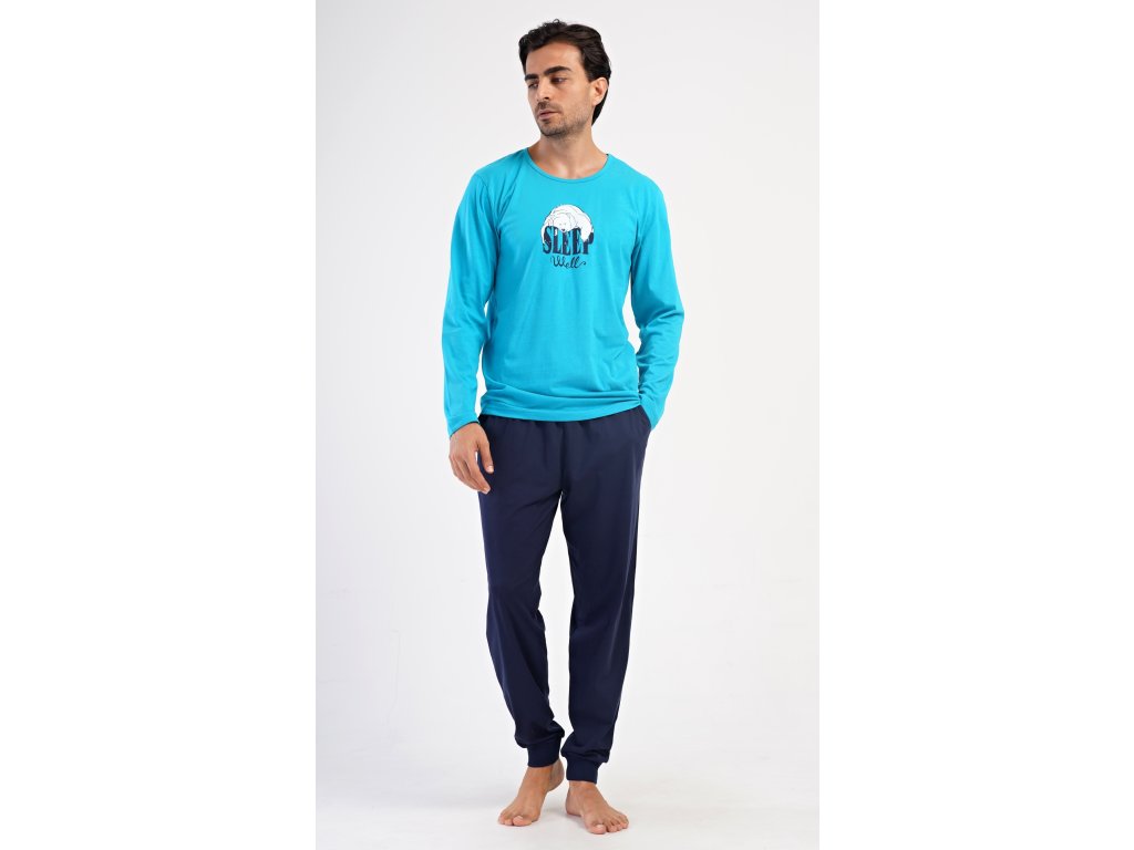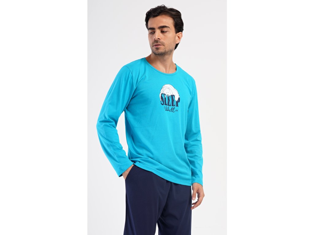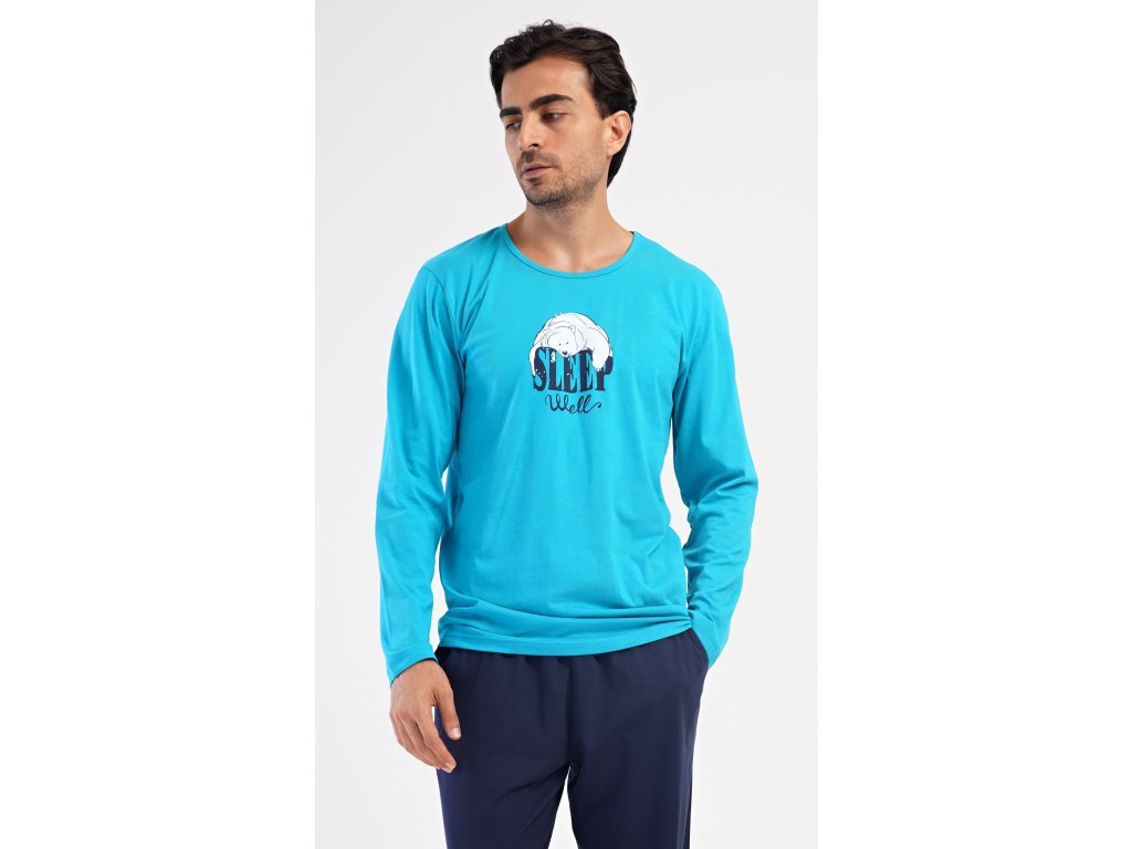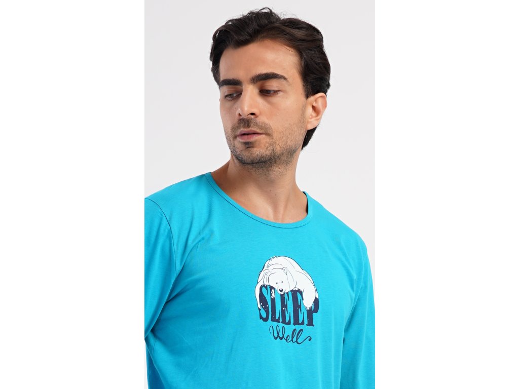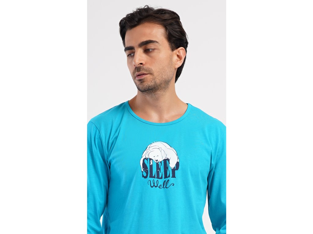 Pánské dlouhé bavlněné pyžamo Sleep. Pánské pyžamo se skládá z trika s dlouhým rukávem a dlouhých kalhot, které jsou zakončeny lemy. Triko s kulatým výstřihem zdobí na hrudi obrázek ledního medvěda a nápis SLEEP WELL. Jednobarevné kalhoty mají v pase gumu, šňůrku na stažení a praktické kapsy. Použitý materiál s obsahem bavlny 100% je poddajný a příjemný na dotek.