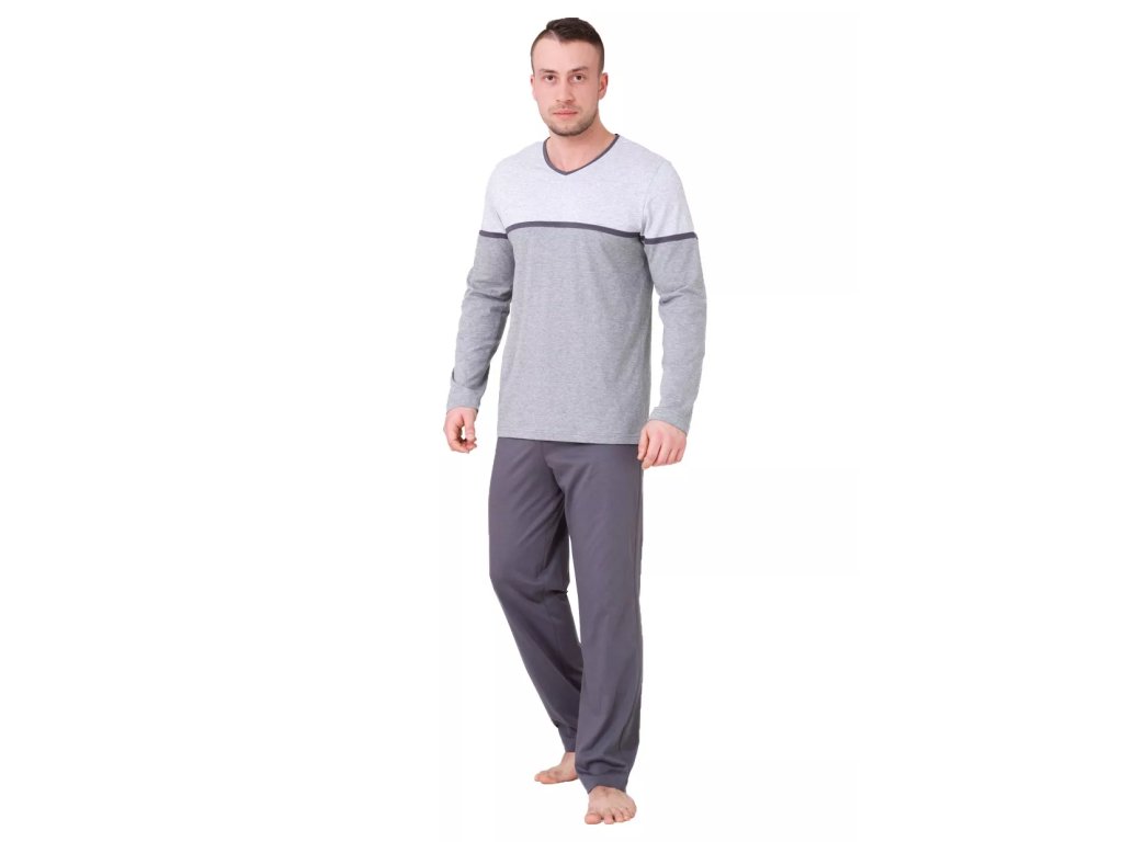 Pánské bavlněné pyžamo s dlouhým rukávem a kalhotami. Dvoubarevné triko je rozdělené pruhem a stejnobarevným lemem kolem krku. Jednobarevné kalhoty jsou šité bez kapes a mají volnou gumu v pase. Pyžamo je možné používat i jako běžné oblečení na doma.