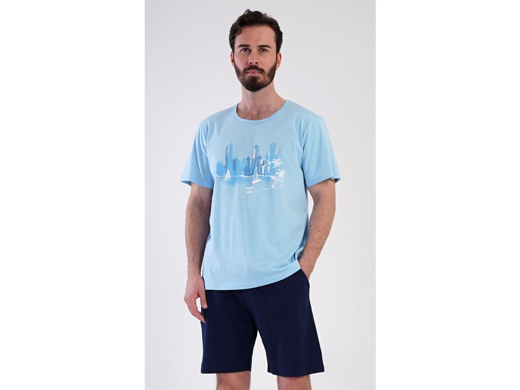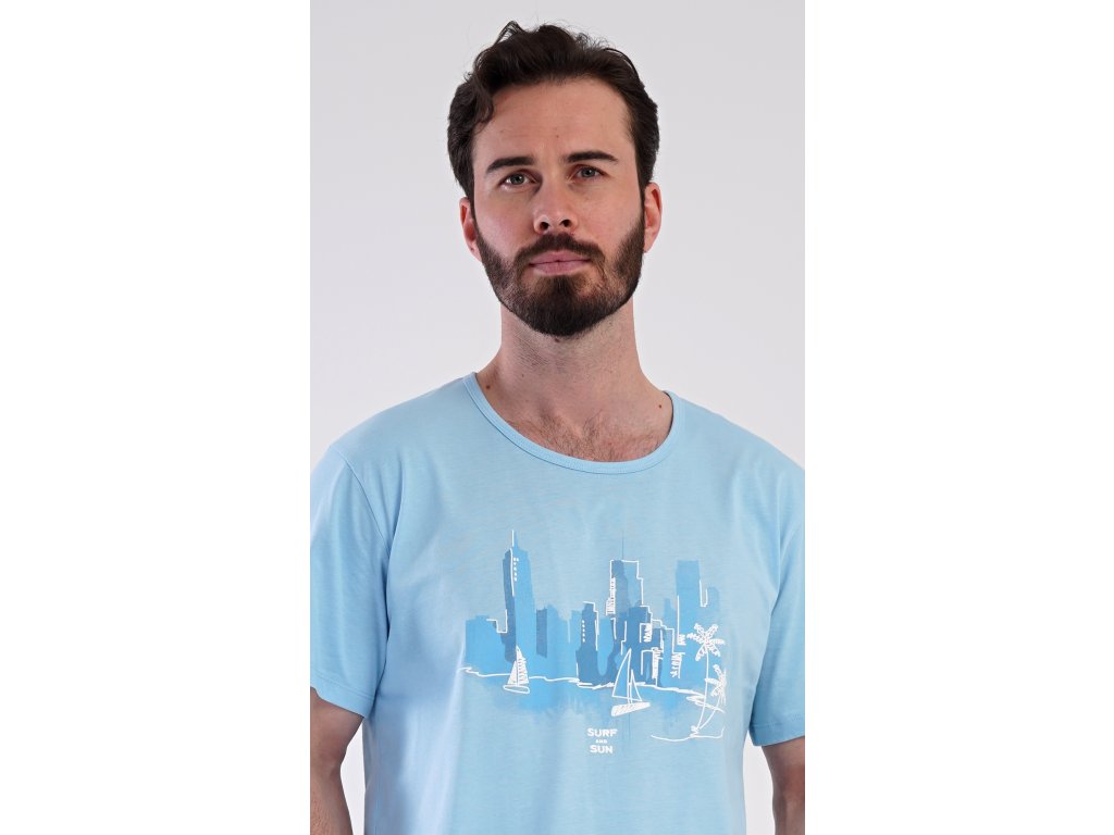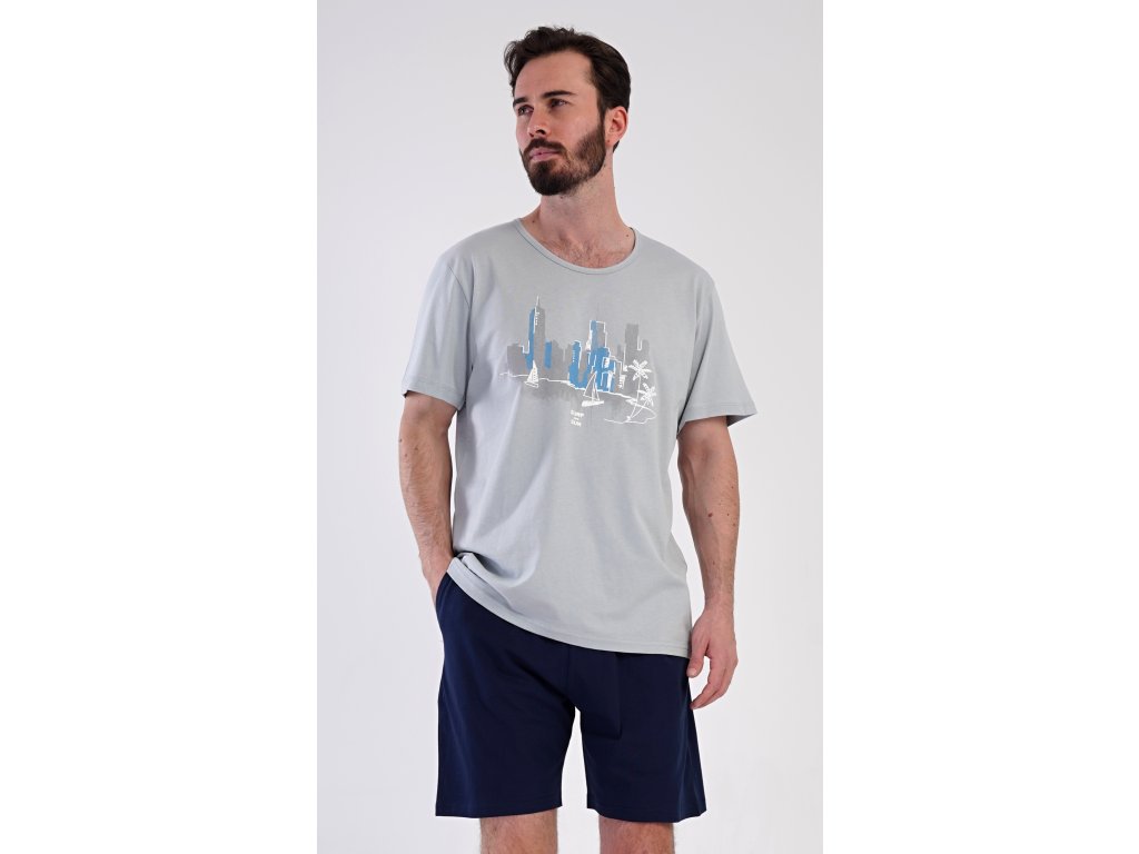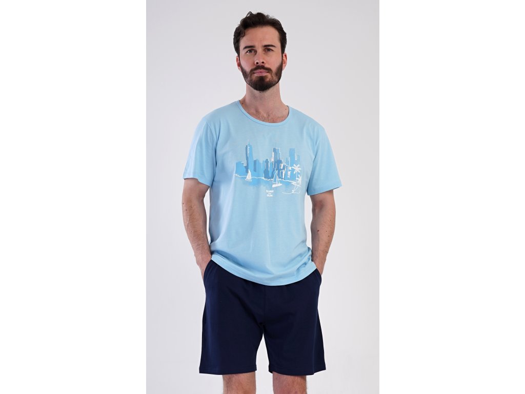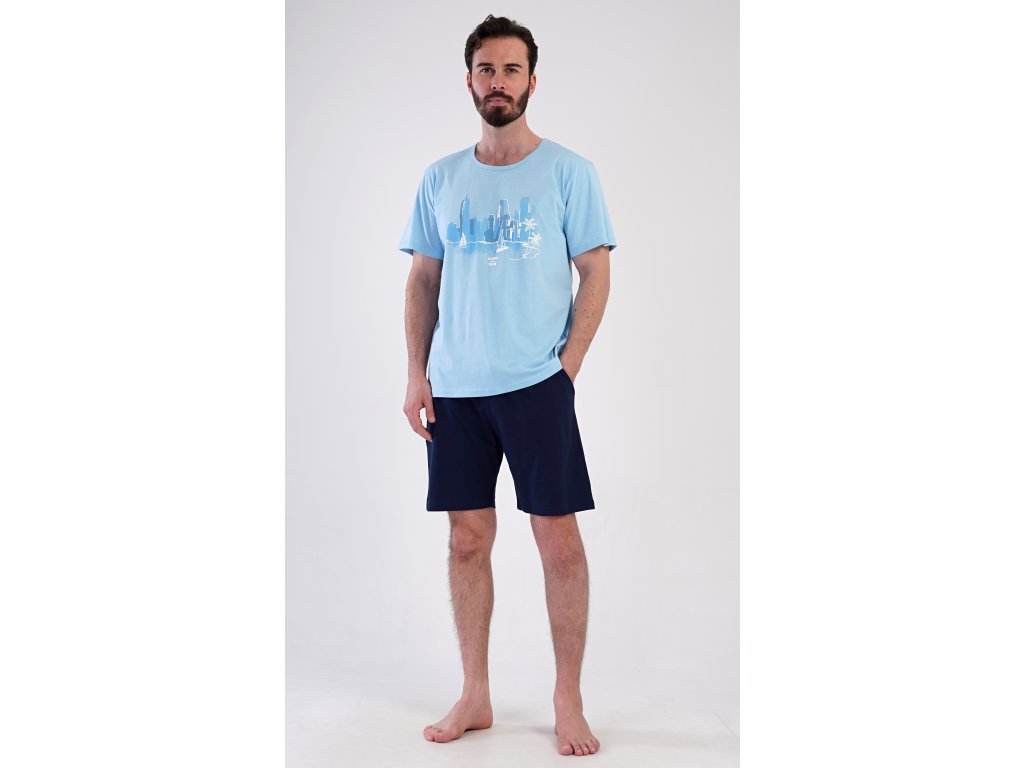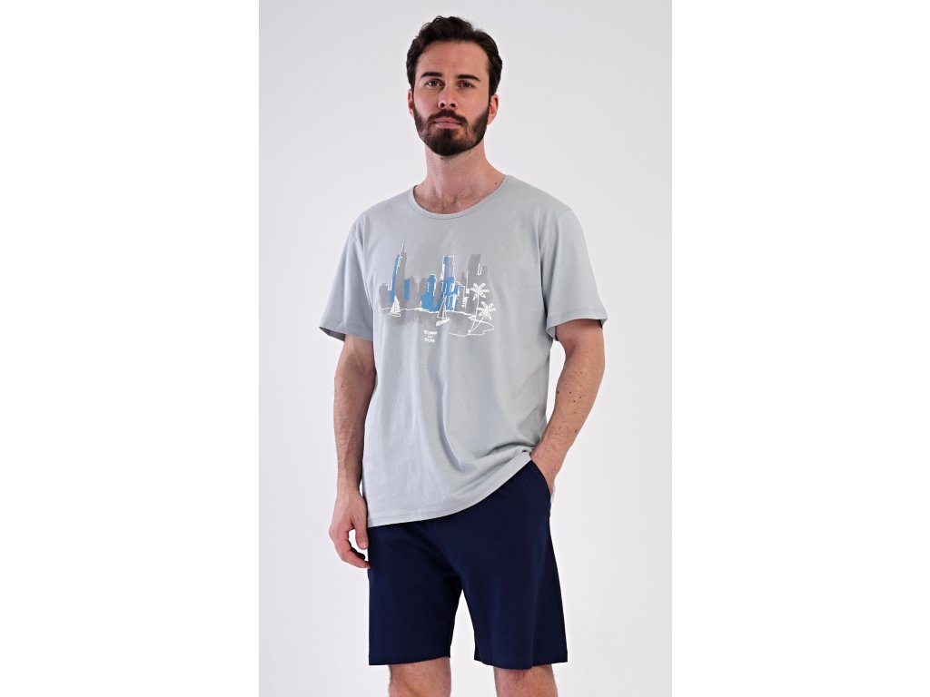 Pánské bavlněné šortkové pyžamo Bruno. Pánské pyžamo se skládá z trička s krátkým rukávem a krátkých šortkových kalhot. Jednobarevné tričko zdobí obrázek zátoky ve velkoměstě. Šortky mají praktické kapsy, v pase gumu a šňůrku na stáhnutí. Použitý materiál s podílem bavlny 100% je příjemný a poddaný na dotek. Pyžamo oceníte obzvlášť v horkých letních dnech.