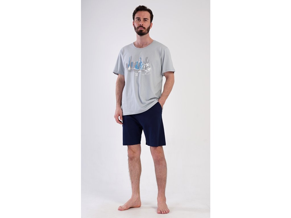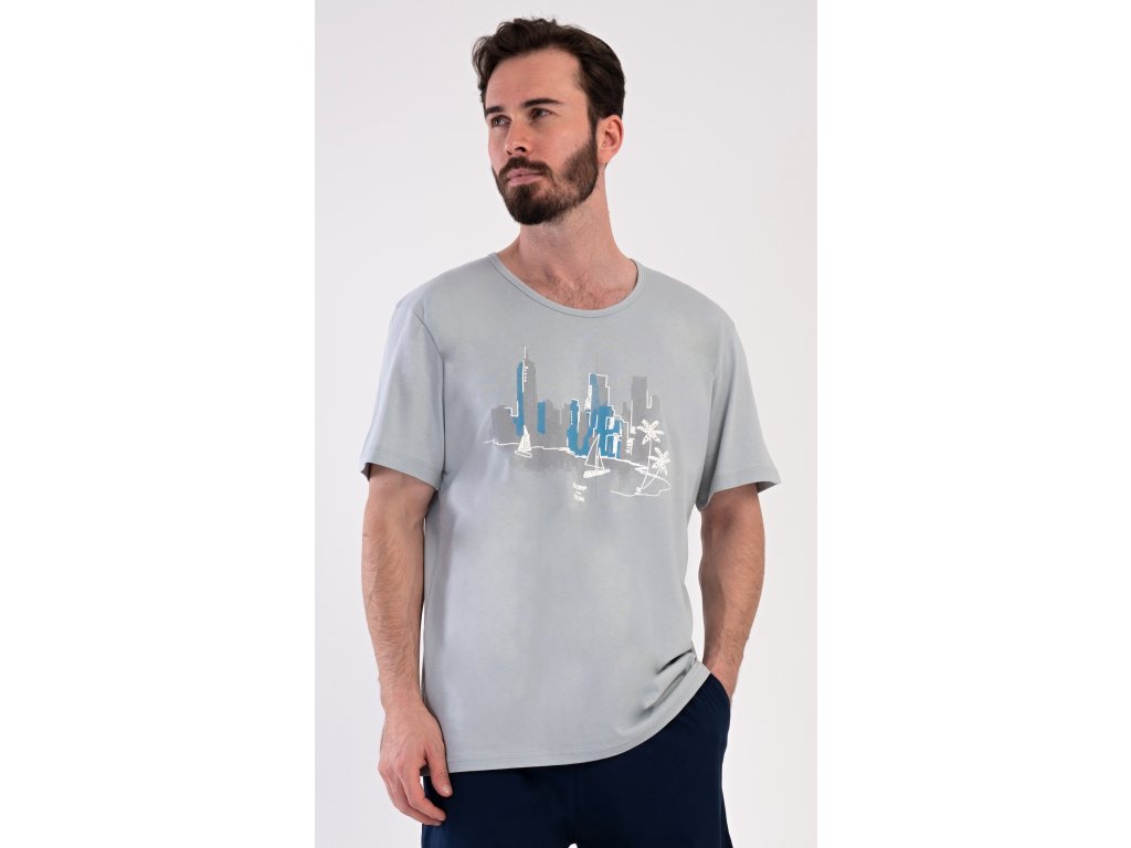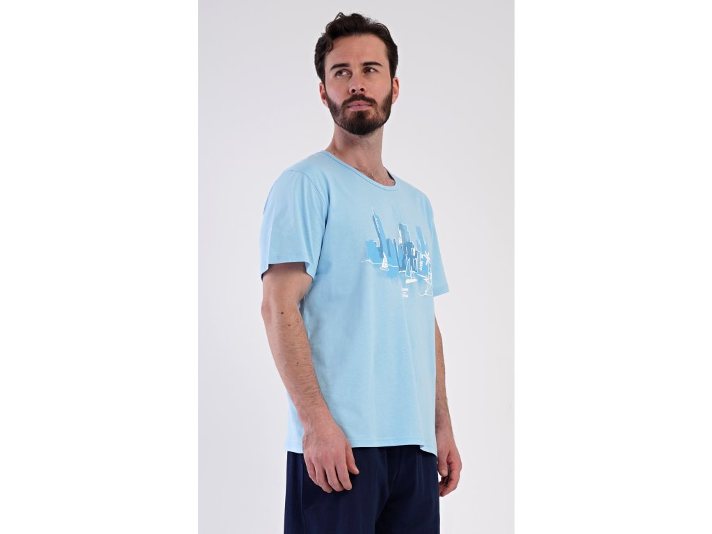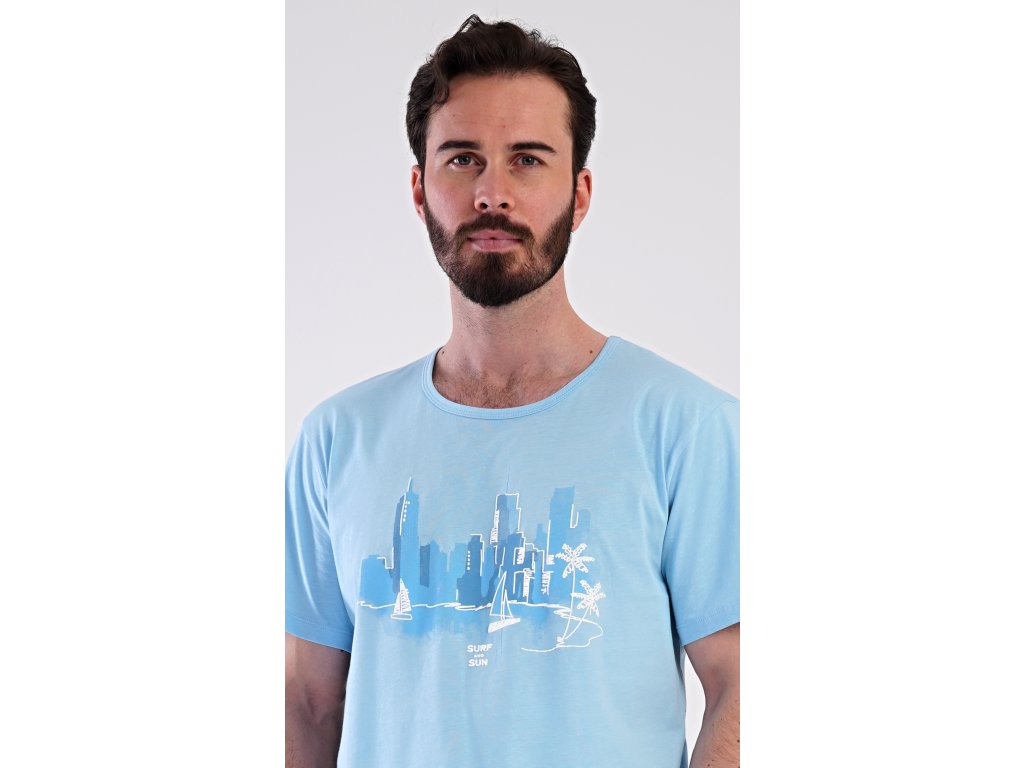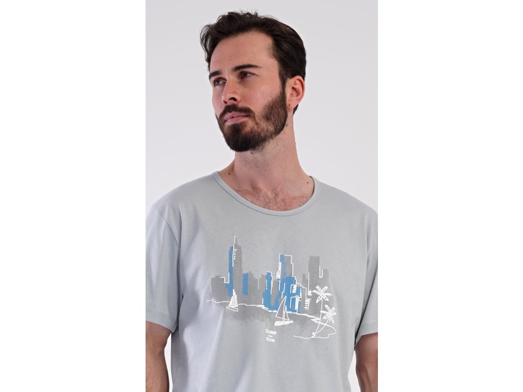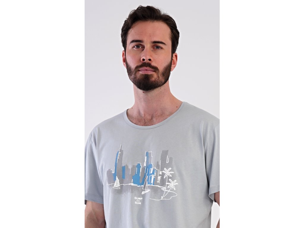 Pánské bavlněné šortkové pyžamo Bruno. Pánské pyžamo se skládá z trička s krátkým rukávem a krátkých šortkových kalhot. Jednobarevné tričko zdobí obrázek zátoky ve velkoměstě. Šortky mají praktické kapsy, v pase gumu a šňůrku na stáhnutí. Použitý materiál s podílem bavlny 100% je příjemný a poddaný na dotek. Pyžamo oceníte obzvlášť v horkých letních dnech.