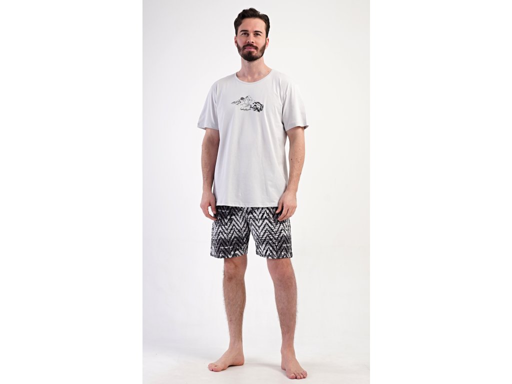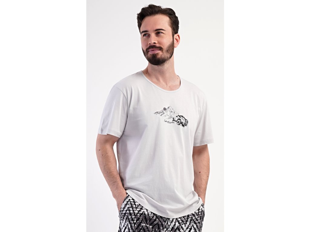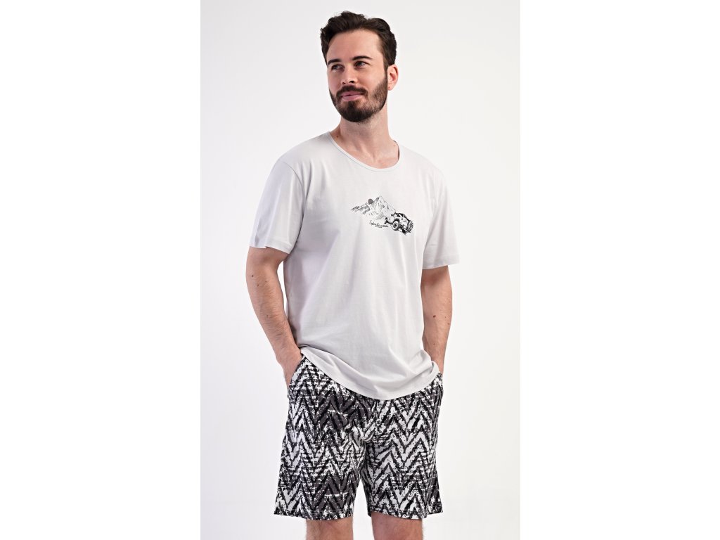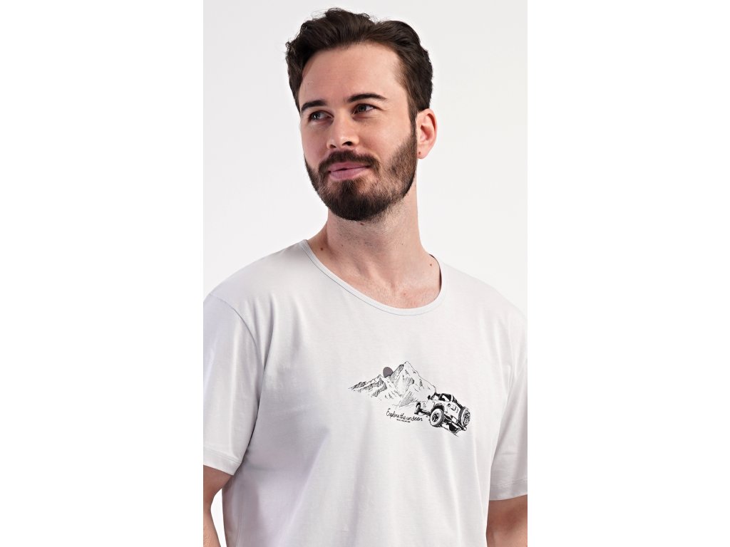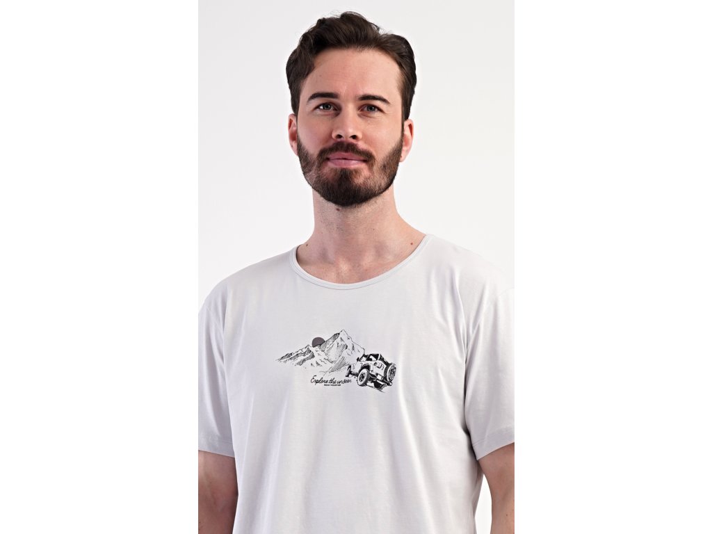 Pánské bavlněné šortkové pyžamo Explorer. Pánské pyžamo se skládá z trička s krátkým rukávem a krátkých šortkových kalhot. Jednobarevné tričko s kulatým výstřihem zdobí na hrudi obázek terénního auta, které jede do hor. Tričko doplňují šortky, které mají v pase gumu, šňůrku na stažení a praktické kapsy. Použitý materiál s obsahem bavlny 100% je příjemný a poddajný na dotek.