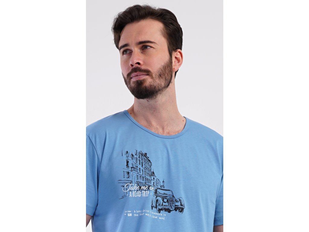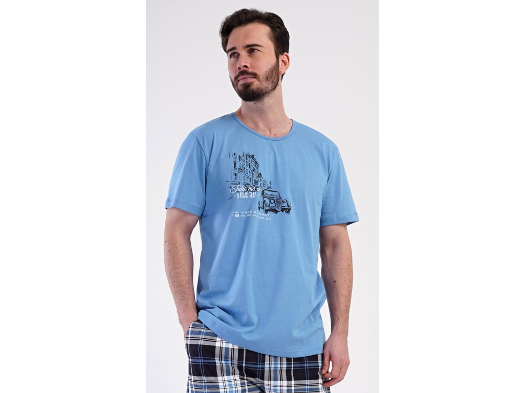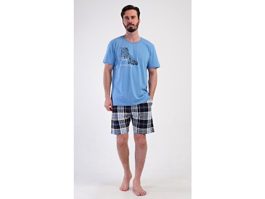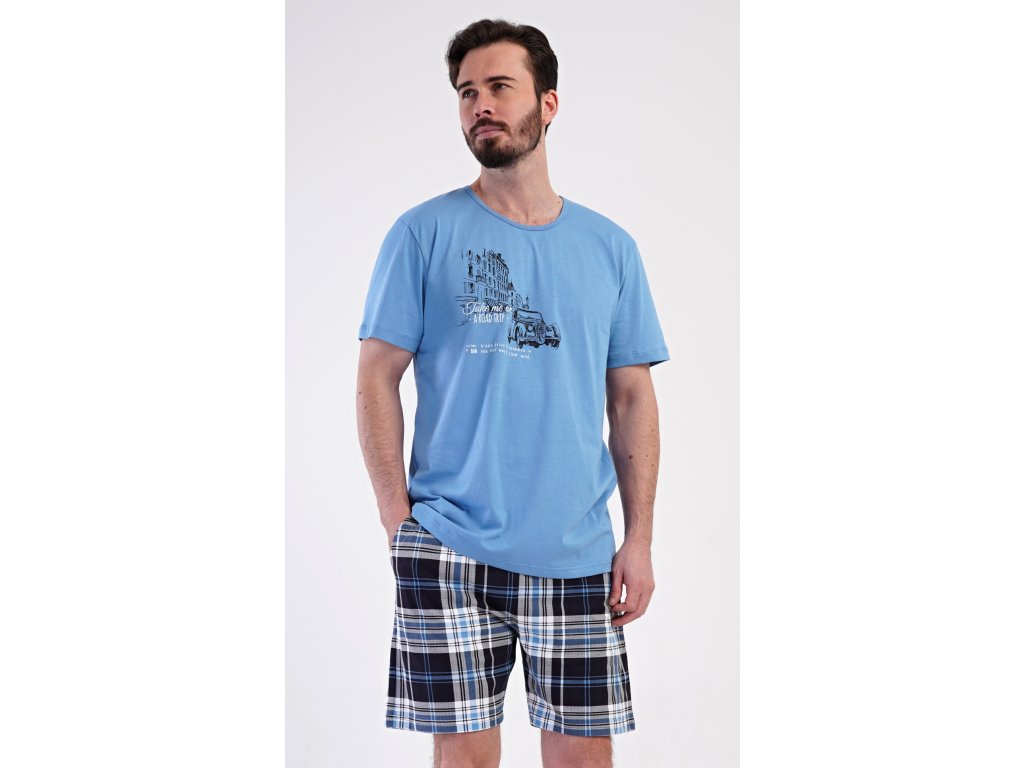 Pánské bavlněné šortkové pyžamo Felix. Pánské pyžamo se skládá z trička s krátkým rukávem a krátkých šortkových kalhot. Tričko s kulatým výstřihem zdobí na hrudi obrázek historického auta. Tričko doplňují kárované šortky, které mají v pase gumu, šňůrku na stažení a praktické kapsy. Použitý materiál s obsahem bavlny 100% je příjemný a poddajný na dotek.