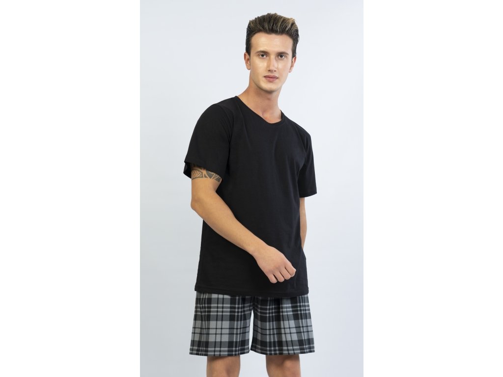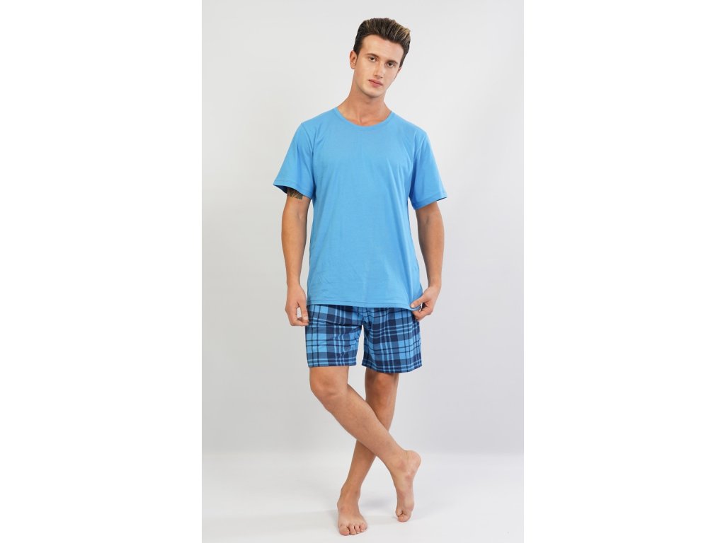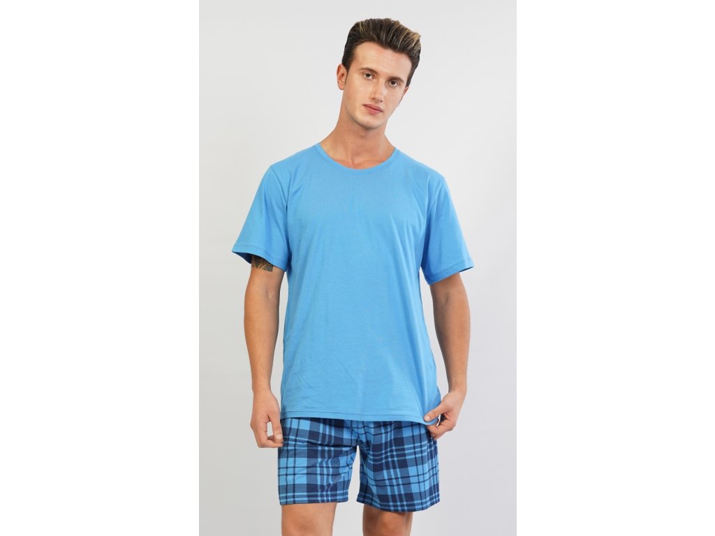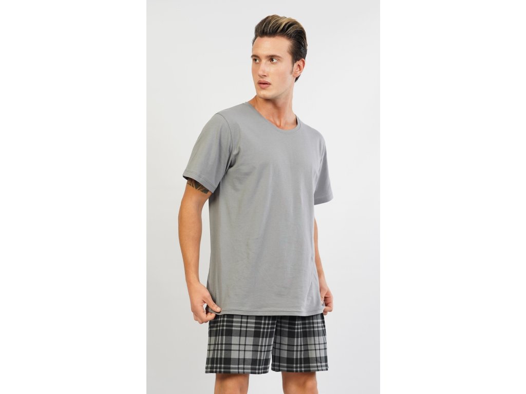 Pánské pyžamo šortky Jiří. Pánské pyžamo se skládá z trička s krátkým rukávem a krátkých šortkových kalhot.Jednobarevné tričko s kulatým výstřihem vhodně doplňují kostkované kalhoty v příjemných tlumených barvách. Použitý materiál je jemný a poddajný na dotek. Pyžamo je vhodné na denní nošení.
