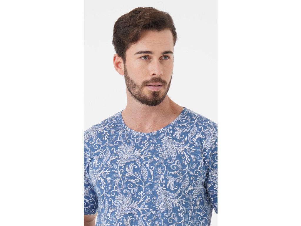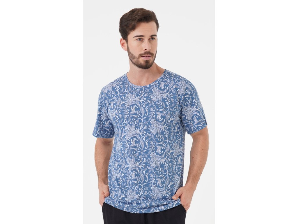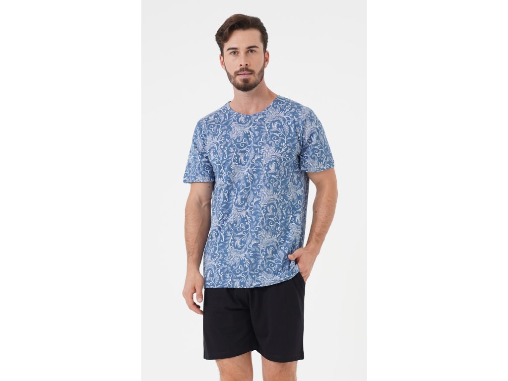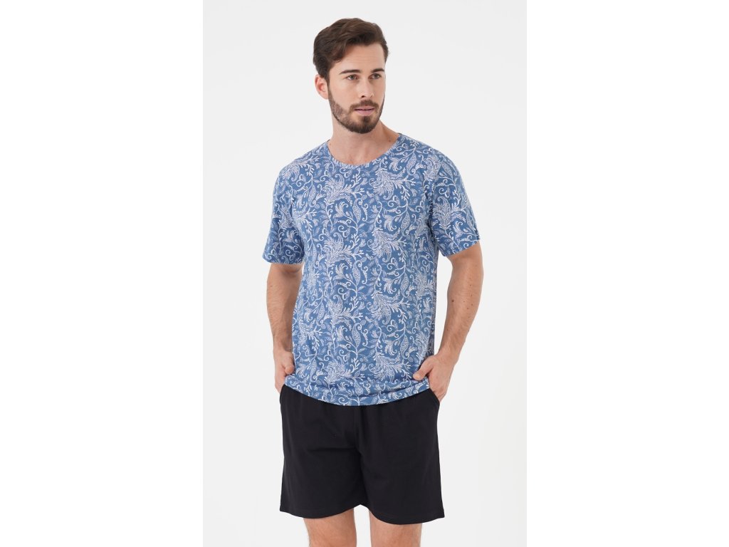 Pánské pyžamo šortky Šimon. Pánské pyžamo se skládá z trička s krátkým rukávem a krátkých šortkových kalhot. Tričko je zdobené florálními motivy. Vhodně jej doplňují jednobarevé kalhoty s praktickými kapsami. Použitý materiál je jemný a poddajný na dotek. Pyžamo je vhodné i na denní nošení.