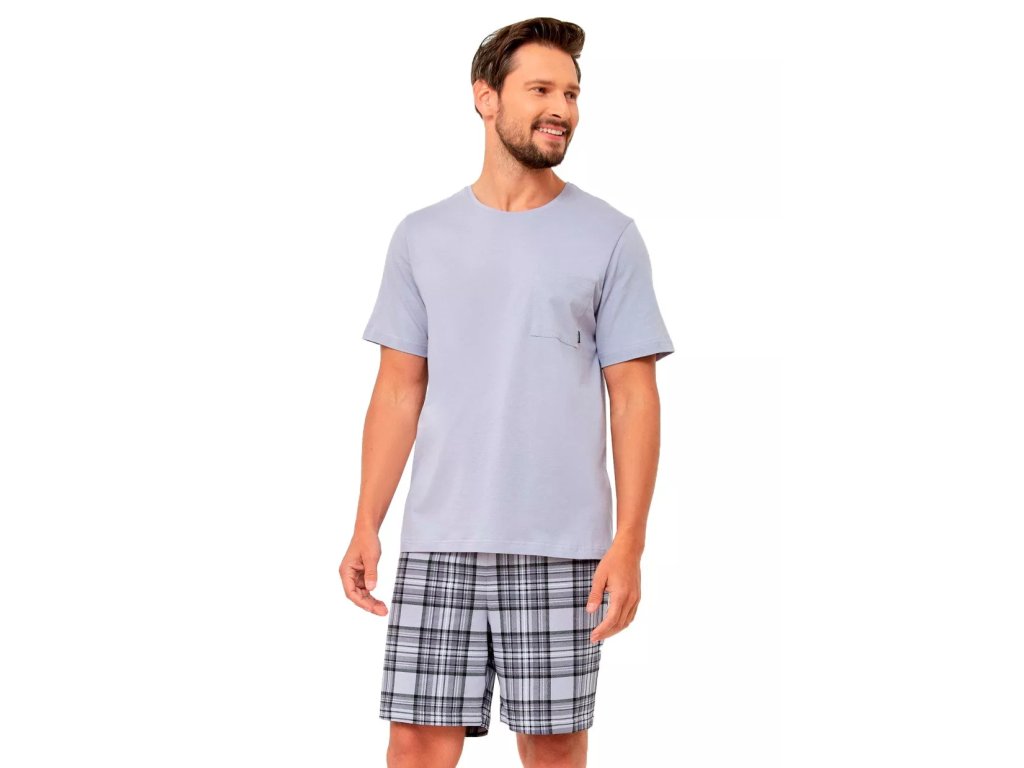 Pánské bavlněné pyžamo s krátkým rukávem a vzorovanými kraťasy. Jednobarevné tričko je s krátkým rukávem a malou kapsou na prsou. Vzorované kraťasy jsou šité bez kapes a mají volnou gumu v pase. Pyžamo je možné používat i jako běžné oblečení na doma.