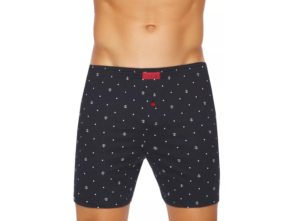 Pánské bavlněné trenky se zapínáním na knoflík a vzorem kotvy. Trenky jsou šité bez švu na hýždích a v rozkroku. Tato technologie šití pánských trenek zvyšuje pohodlí při nošení a odolnost vůči oděru.